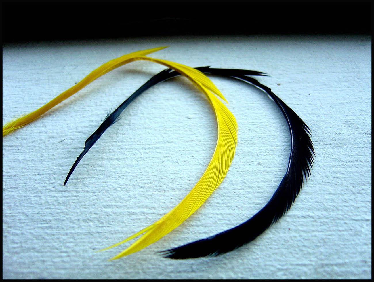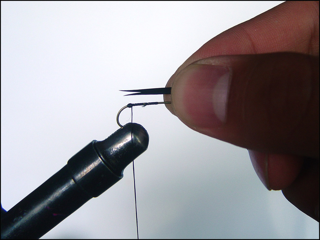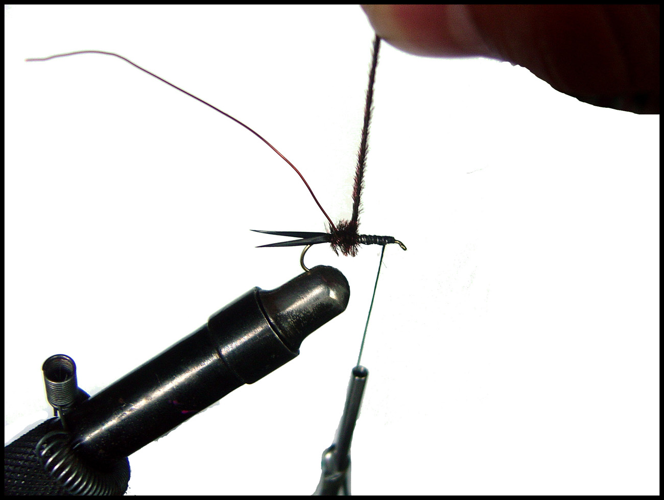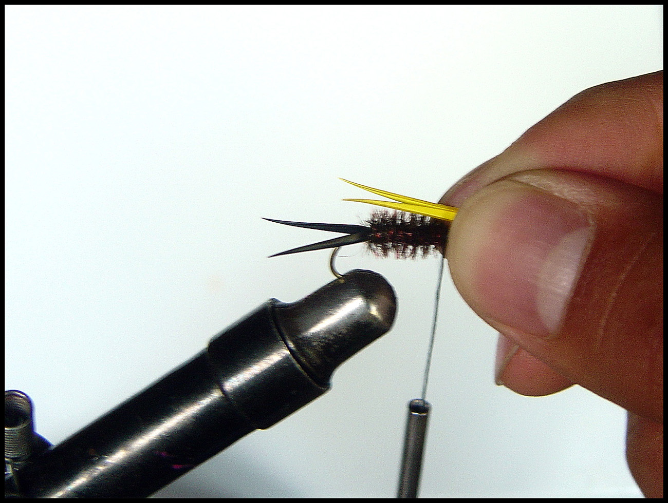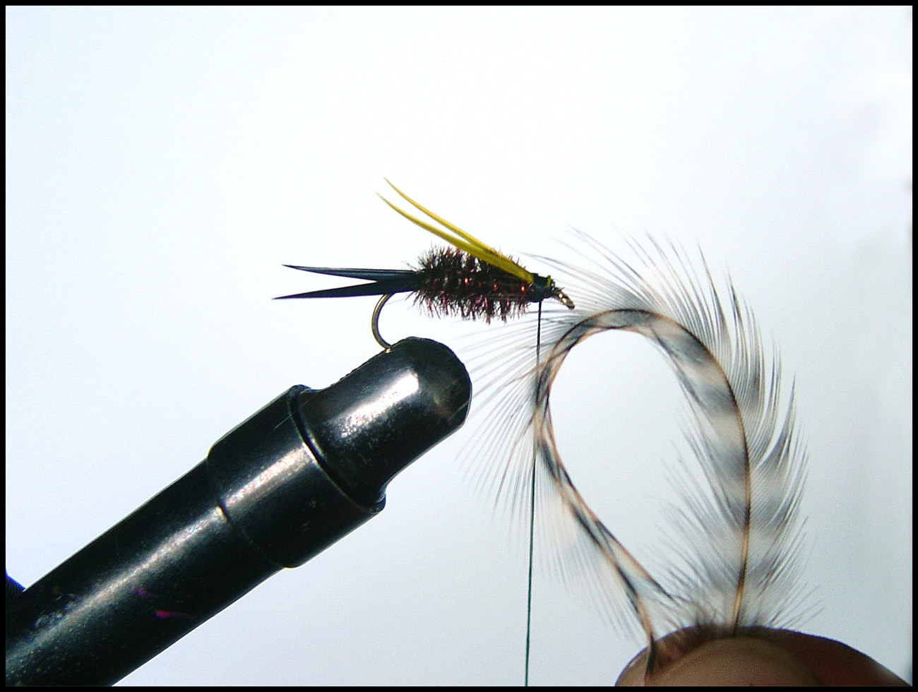 5. ウィングを巻き付けます テールと同じようにまず長さを測ってから巻き付けます。目安はシャンクの長さですね このウィングなんですが、ボディーからできるだけ離れているほうがカッコイイと僕は思います。そのためのコツは、テールと同じく始めはゆるめに巻き後でギュギュっきつめに(スレッドが切れない程度)と巻いていくとグース・バイオットがグングン反っていきボディーから離れていきます あちゃ、ちょっとファイバーが長かったかも ![]() 余分な毛を取ってからウェットフライの様に巻き付けます