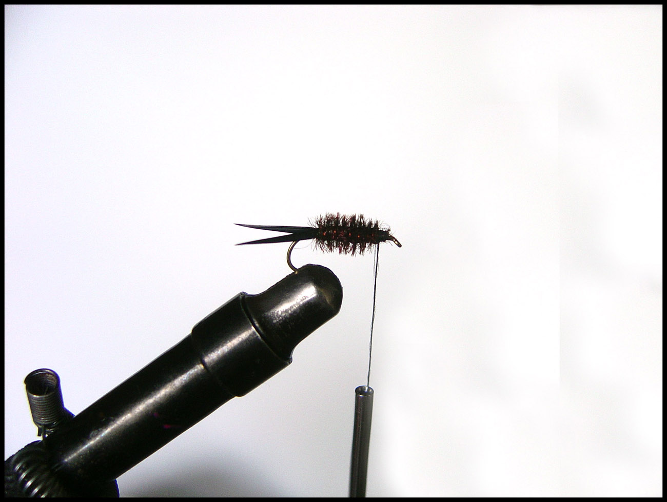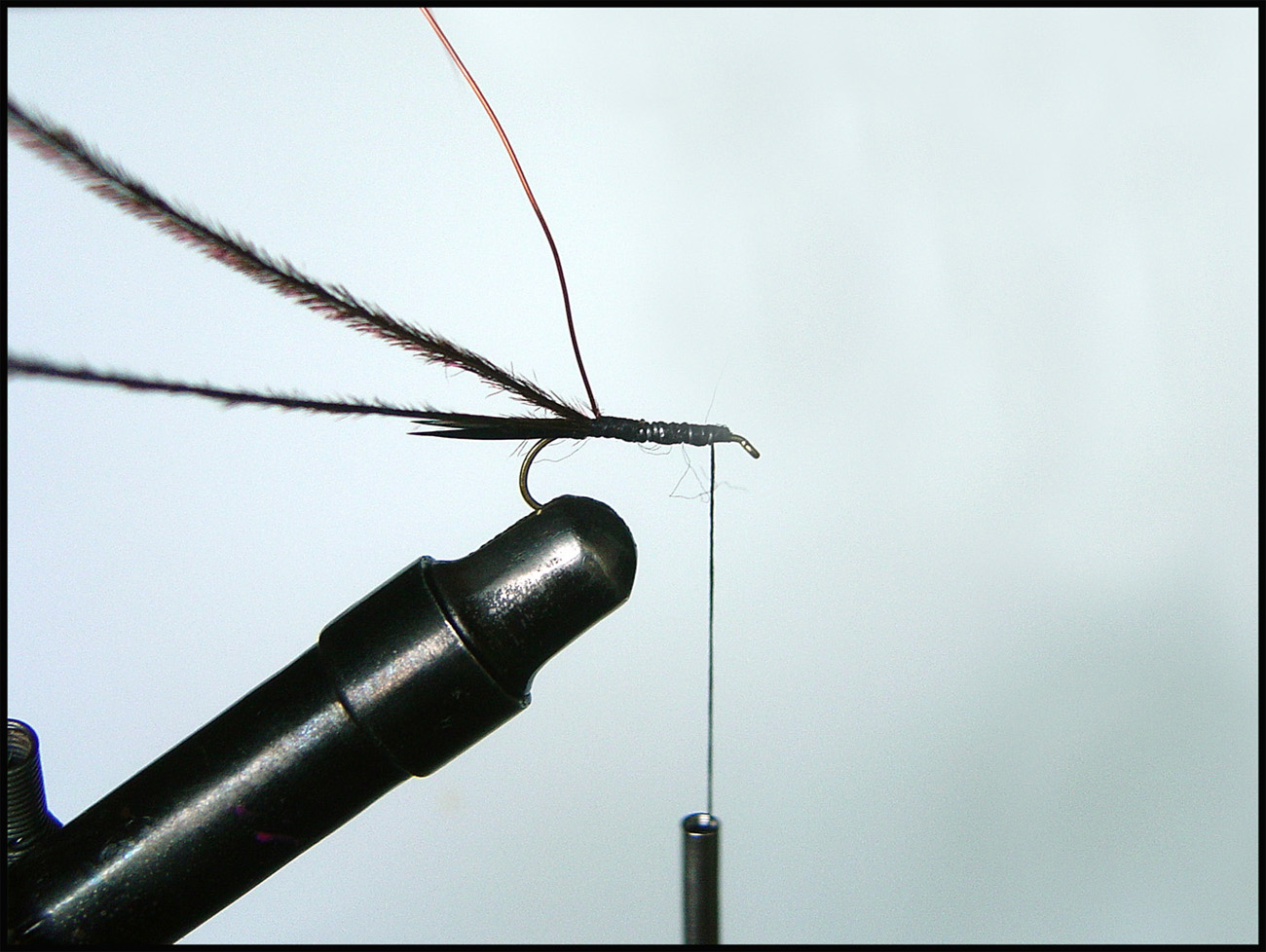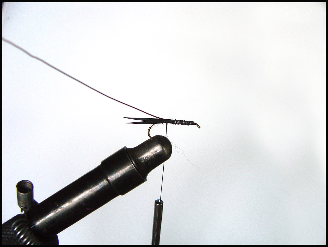 3. ウェイトとリブを巻き付けます 実はウェイトはテールを巻き付ける前に普通やるんですが、まあ大目に見てください ![]() 今回は銅の針金をリブとして使いました、太いから結構ウェイトとしての役目もあります